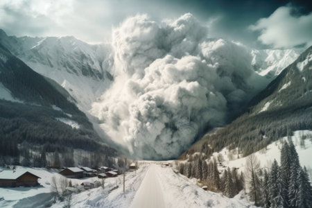 a giant avalanche falling from the mountains onto a village. Generative AI