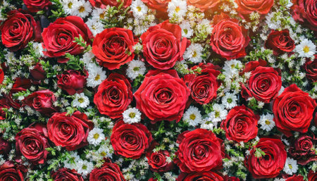 Experience the charm of natural fresh red roses with this captivating floral pattern wallpaper. This top-view image of radiant red rose flowers creates an exquisite wall background, ideal for