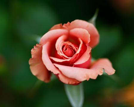 Macro shot of the Peace rose, formally Rosa 'Madame A. Meilland'. Bud of garden hybrid tea rose in botanic garden.