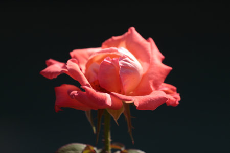 Beautiful rose flower isolated against the dark background, dewdrops on the flower petals.