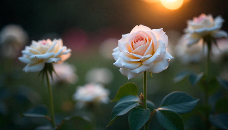 A bush of white roses in summer sunset backlight. selective focus macro shot with shallow DOF.