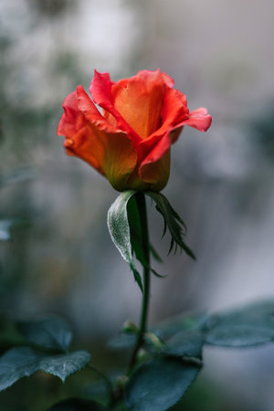 One two-color red orange rose bloom in garden. Dark mood Cold green background. For holiday cards, Valentine Day.