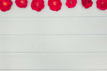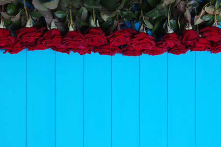 Red roses flowers on blue painted wooden planks.