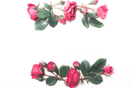 Framework from roses on white background. Flat lay.