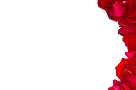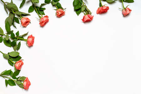 Frame made of fresh red roses flowers on white background. Beautiful floral composition, greeting card for holiday. Flat lay, top view, space for text, mock up.