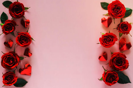 Red roses arranged on a wooden surface forming frame