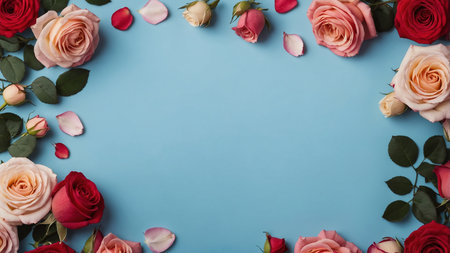 A beautiful arrangement of pink, red, and peach roses along with scattered petals on a blue background, creating a stunning floral frame perfect for stock images or backgrounds. AI generated image