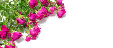 bouquet of small red bush roses on a white background, banner with place for text