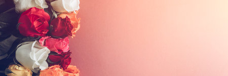 Bunch of colorful roses. Beautiful bouquet of roses in variety of colors on dusty pink background with copy space, banner size