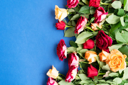 Red and orange rose flowers on a blue colored background. Flat lay style.