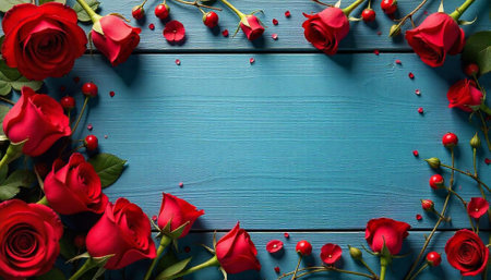 Red roses and berries frame on a blue wood background
