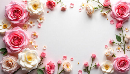 Pale pink roses frame blank white space for text overlay