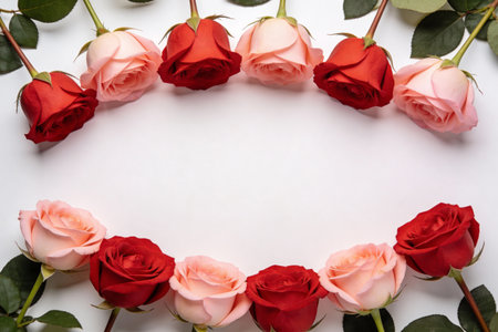 Freshly cut roses in vibrant red and soft pink hues are artfully arranged in a circular pattern against a clean white background