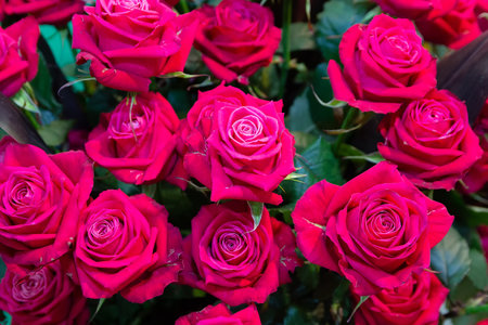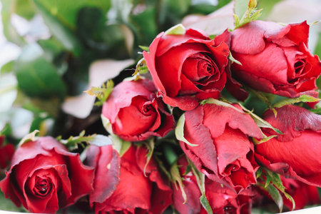 Natural red roses background in flower shop. Valentine's Day.14th of February greeting card. Mother's day floral card. Women's Day. Flowers gift. Flower delivery. Wedding invitation. Happy birthday