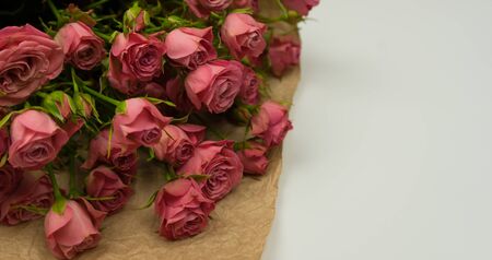Header with bouquet of rose flowers on a pink background. Present for Mothers Day. Festive concept with place for text.