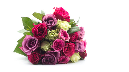 The woman's hands are holding a beautiful bouquet of fresh multicolored roses. Flower composition isolated on white background. Festive card concept