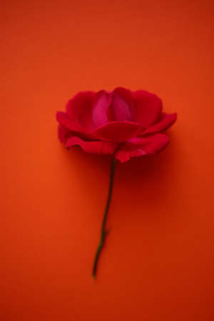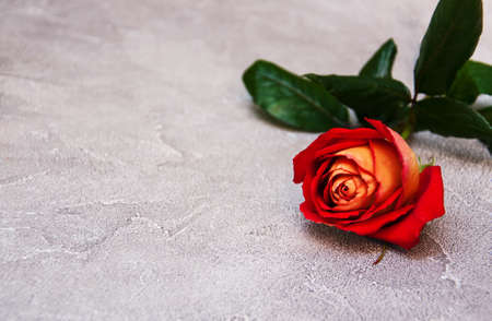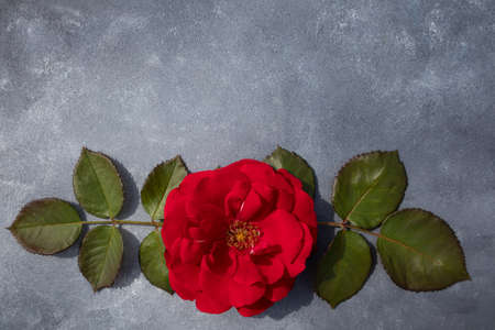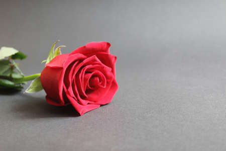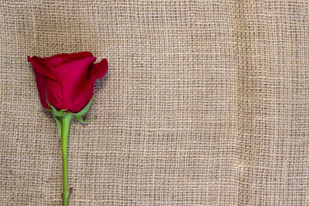 Beautiful dark red single rose on gray rough linen textured background close up with copy space top view