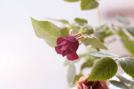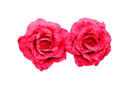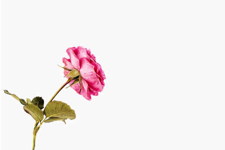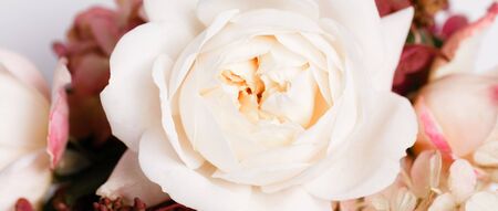 Abstract floral background, dried rose bouquet close-up on a white background, place for text, top view