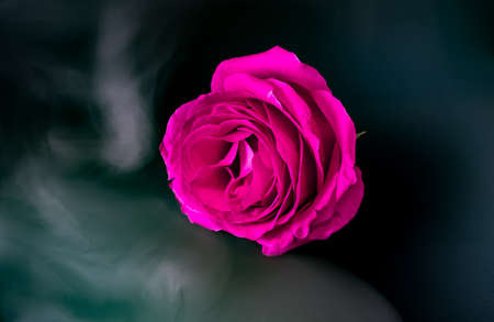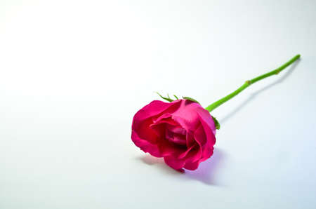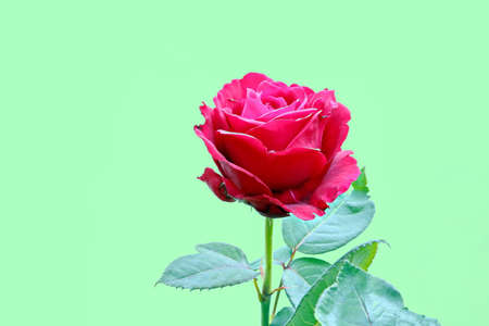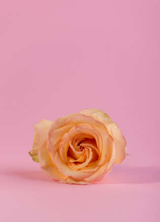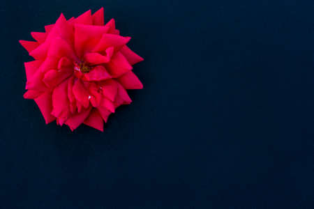 High angle closeup of fresh pink single rose with copy space over blue background. love and valentine.