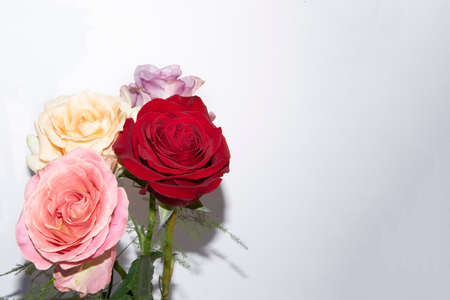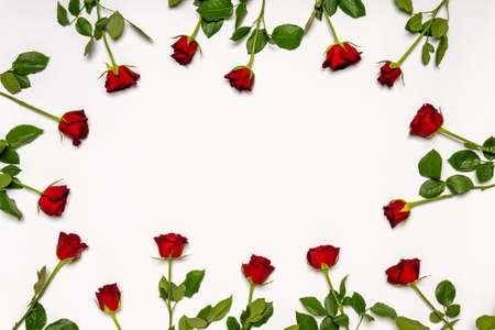 Blooming red roses on a white background. Top view.Creative flat lay, copy space.