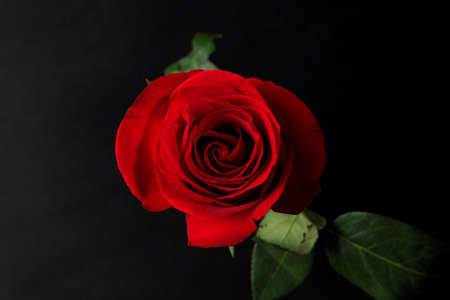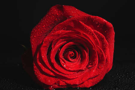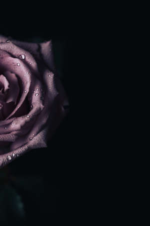 Close-up of rose flower with rain drops on petals. Delicate rose on black background.