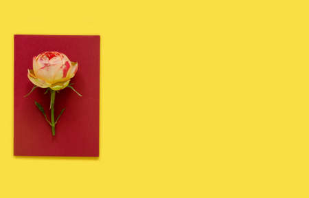 Floral arrangement, web banner with pink roses, and leaves on yellowtable background. Minimalistic concept for the spring holidays. Flat lay, top view, copy space concept.