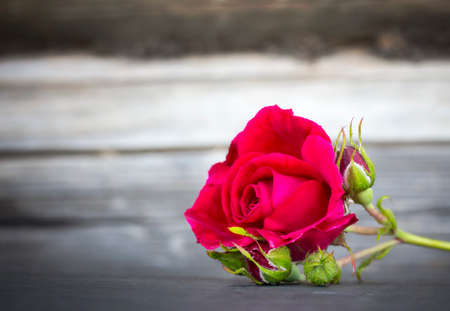 red rose on a wooden surface against a wooden wall with a copy of the space