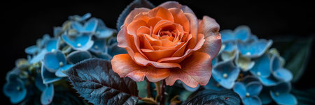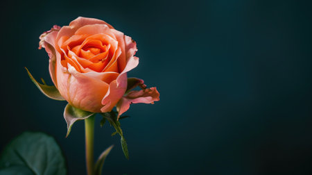 Single peach-colored rose against dark blue background, showcasing delicate and elegant bloom with soft lighting