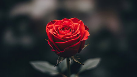 A striking close-up showcases a solitary red rose, its petals fully open and vividly colored. The image features a dark, blurred backdrop that emphasizes the flower. Soft lighting creates a moody atmosphere. Suitable for romantic themes, design projects, and editorial content relating to nature or beauty.