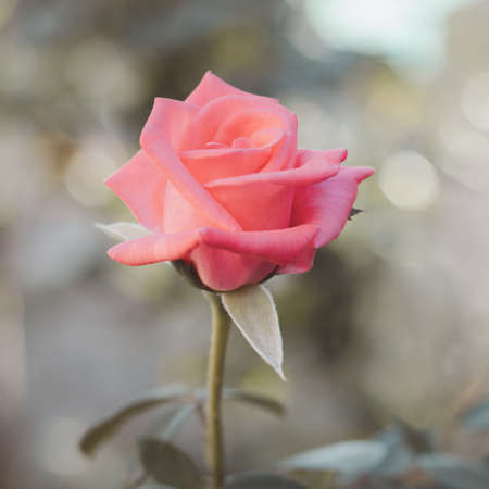 One coral rose on a blue background. Copy space. Concept Mother's Day, Family Day, Valentine's Day