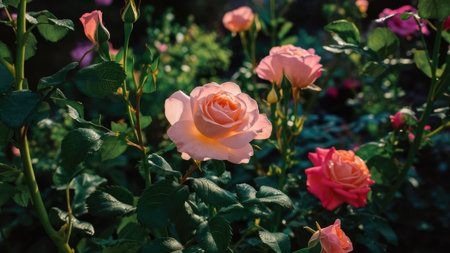 A stunning rose garden illuminated by the soft light of sunset, featuring vibrant orange and pink flowers amidst lush greenery, creating a tranquil evening atmosphere.