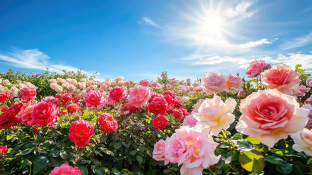 Vibrant rose garden in full bloom under the sun showcasing pink red and white roses with soft petals