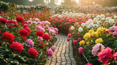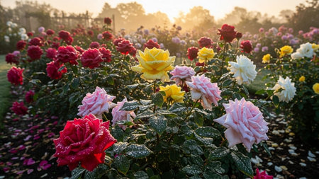 Lush Rose Garden Displaying a Variety of Colorful Roses Under Soft Sunlight
