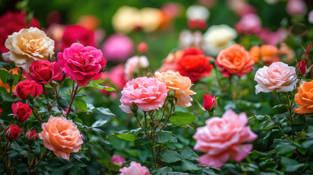 A rose garden in full bloom, with various colors of roses creating a vibrant and fragrant landscape