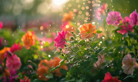 Garden roses covered in morning dew, illuminated by soft golden light at sunrise