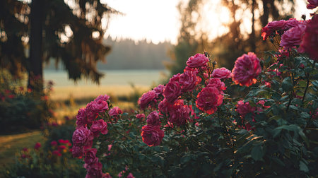 This image presents a bush of pink roses in full bloom, illuminated by warm sunlight. The composition features a shallow depth of field, focusing on the flowers while the background suggests a garden setting. The overall aesthetic is natural with soft textures and color gradients that could be ideal for various commercial projects.