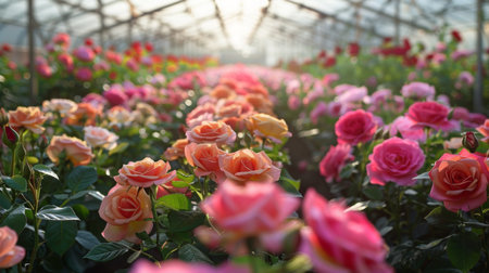Vibrant Roses Blooming in a Greenhouse at Sunrise