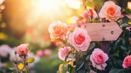 A serene garden scene featuring vibrant pink roses and a charming wooden signpost, bathed in warm sunlight, creating a tranquil outdoor atmosphere.