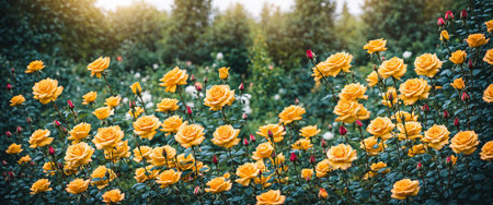 A stunning display of golden roses in a sunlit garden highlights the beauty of nature, with a soft focus that creates a serene and tranquil atmosphere. Perfect for floral themes.
