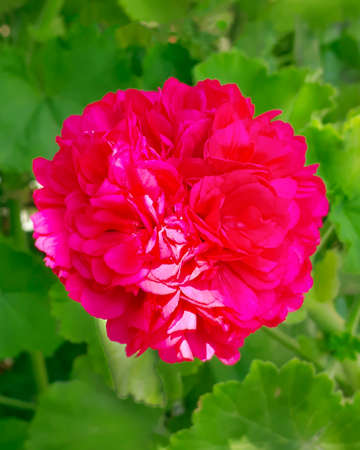 Terry pink pelargonium against green foliage and defocused background. Bokeh effect. Close-up side view. Place for an inscription.