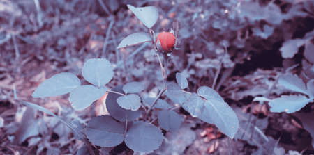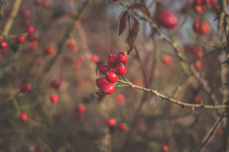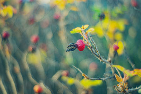 Briar, wild rose hip shrub in nature, autumn fall color tone