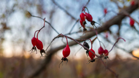 blurry photo, shallow depth of field. Rose hips contain a large amount of antioxidants, mainly polyphenols and ascorbic acid, as well as carotenoids and vitamins B and E.