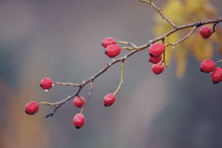 Hawthorn with red berry on the branch, autumn rain water drops, bokeh, shallow depth of the field, toned