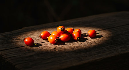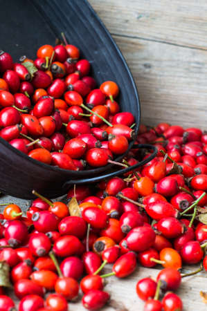 Fresh berries of wild rose, vintage wood background, selective focus