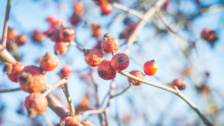 Ripe rose hips on a tree branch, winter red berry