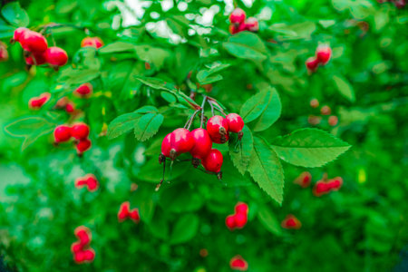Close up wild rose hips bush in nature with bright wild rose or dog rose berries Red hips with leaves.