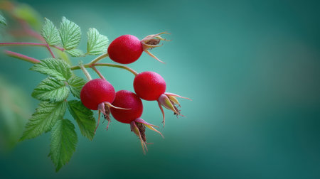 This stunning close-up captures fresh rose hips resting on a leafy stem, showcasing vibrant colors and serene natural beauty in a blurred background.