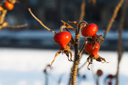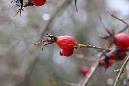 Dog Rose or Rosa Canina branches with bright fruits in the winter