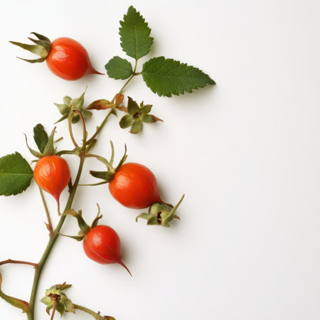 Bright red rose hips arranged artistically against a clean white background highlighting their natural beauty and vibrant color.
