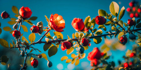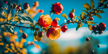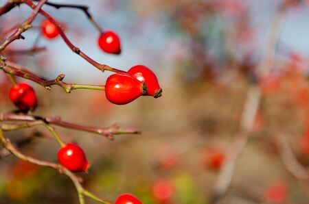 Rose hips on a bush branches, soft focus in strong autumn sun back light.